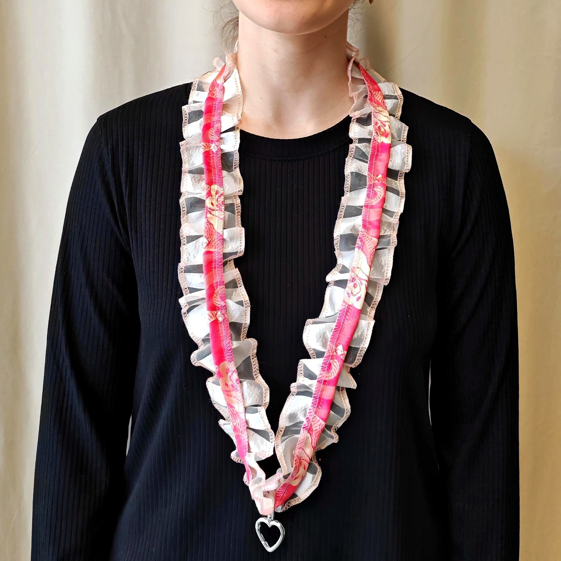 Materiaali: hihna kierrätys- ja ylijäämätekstiilejä, sydämen muotoinen